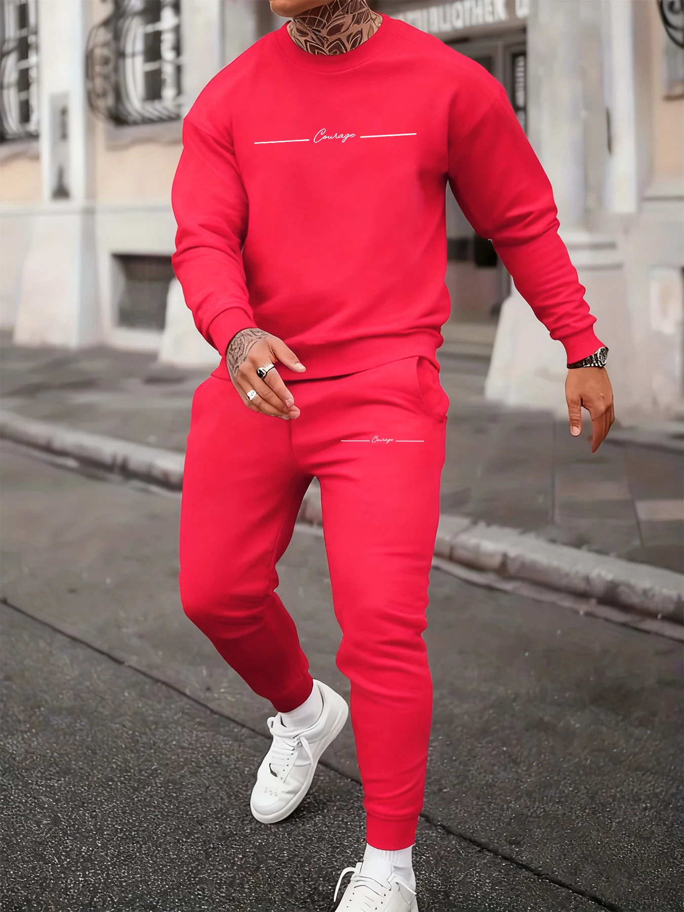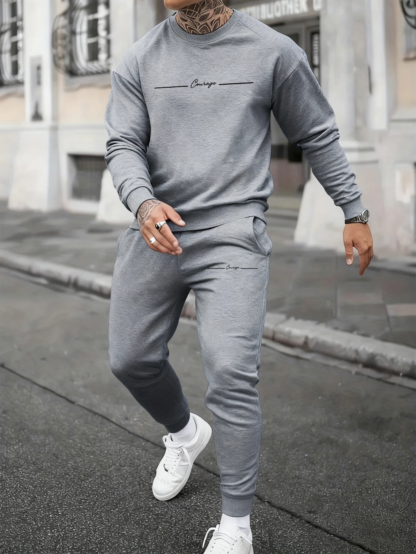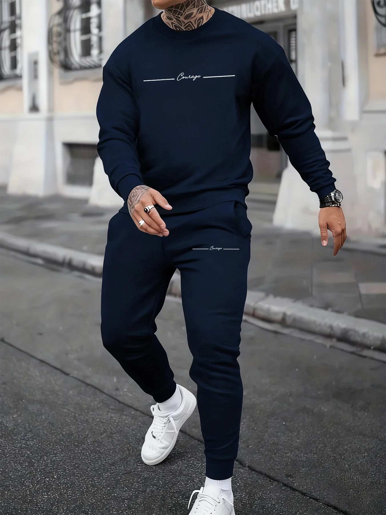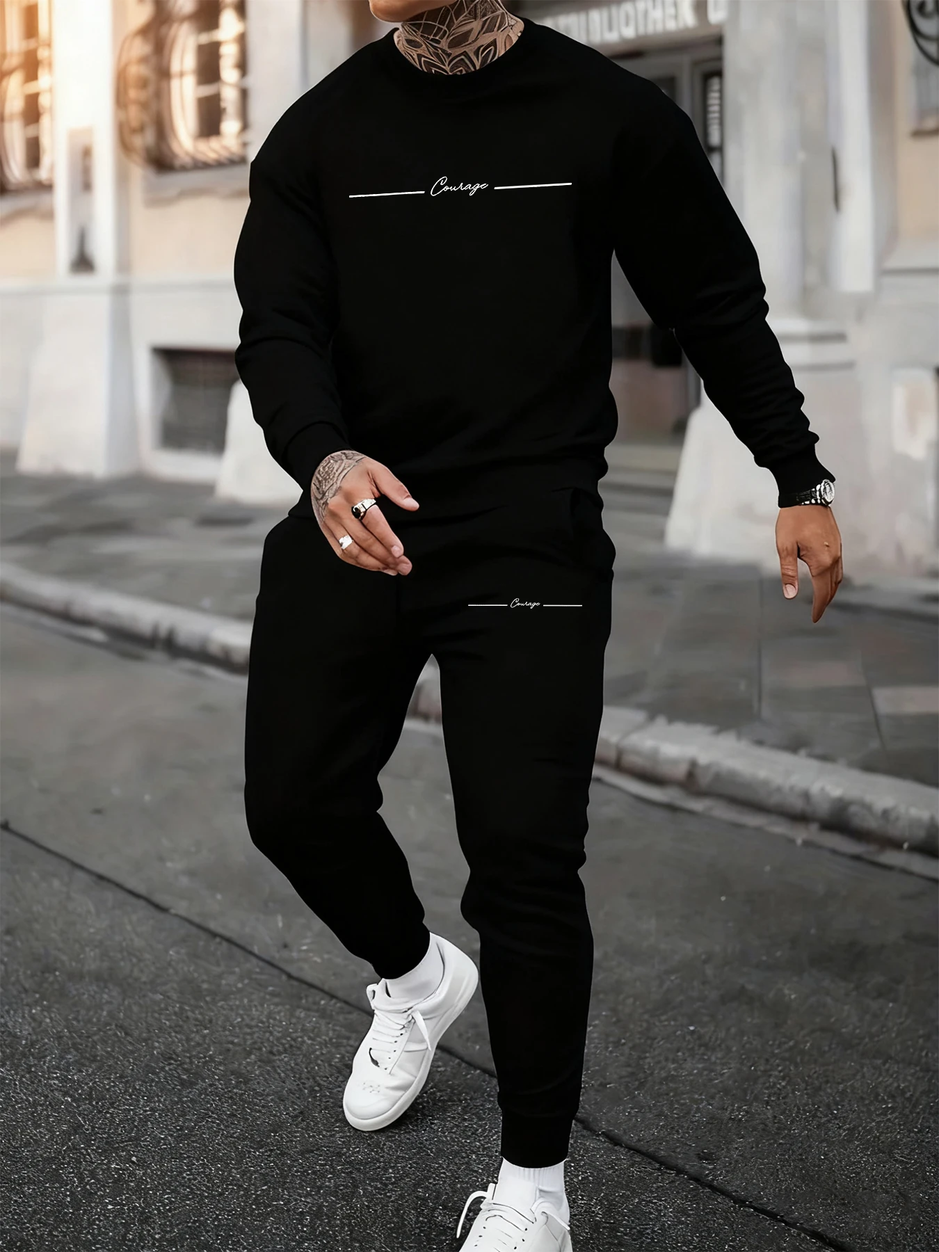 طقم ملابس رجالي خريفي , بلوزة برقبة دائرية وبنطال رياضي مطبوع