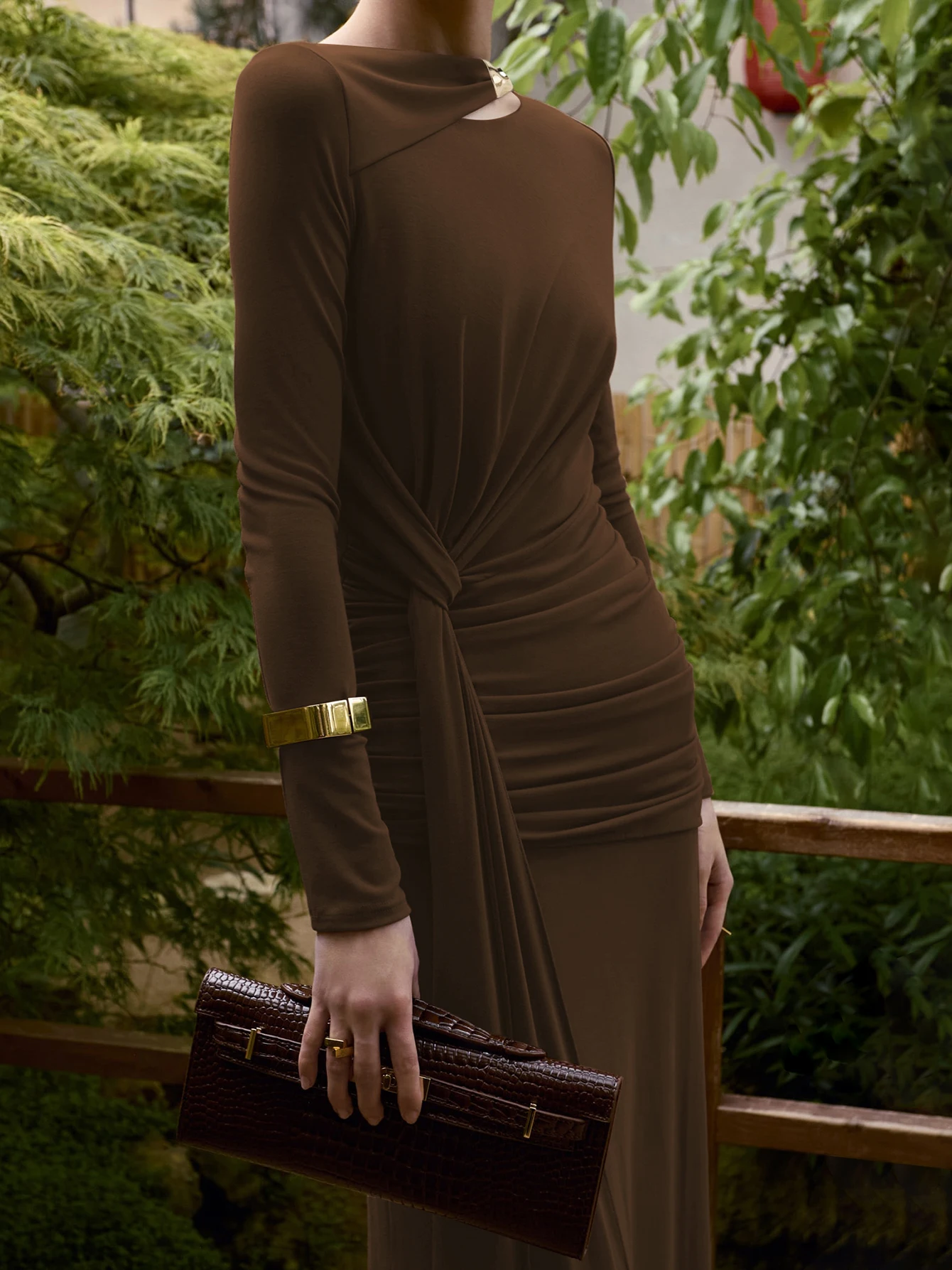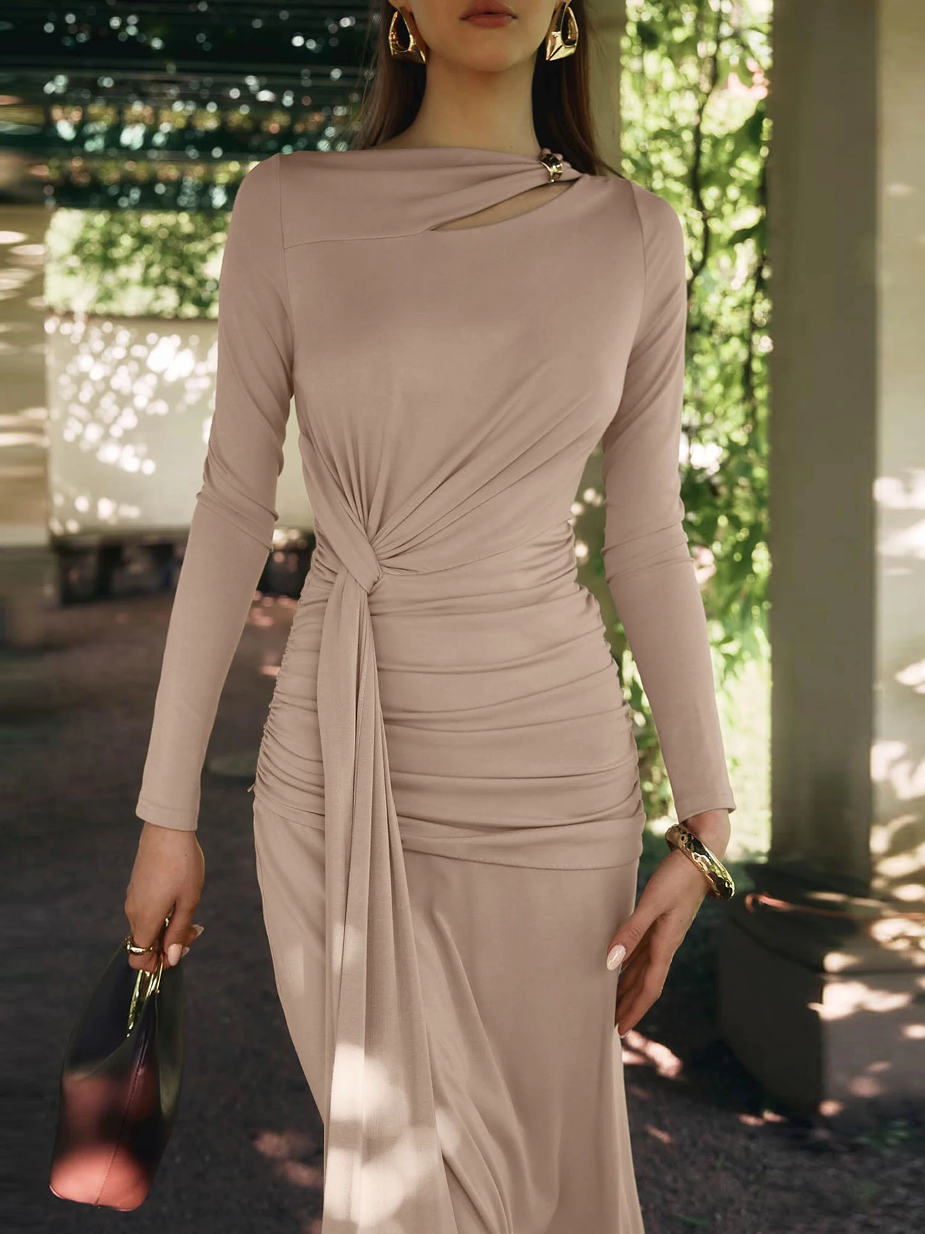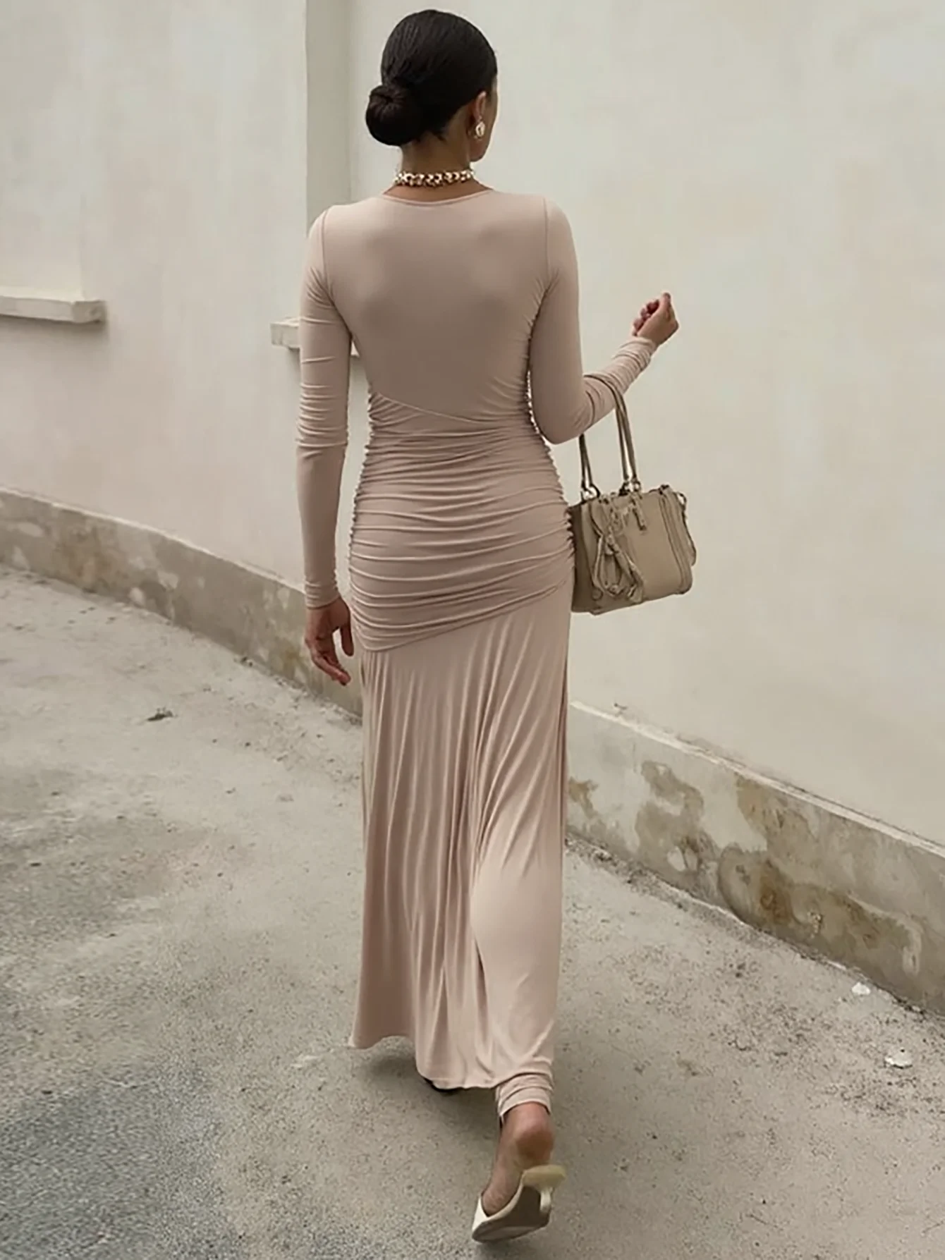 فستان طويل نسائي Dulzura – برقبة S وأكمام طويلة، قصة ضيقة مع تجعيد وزخرفة معدنية للحفلات والمساء